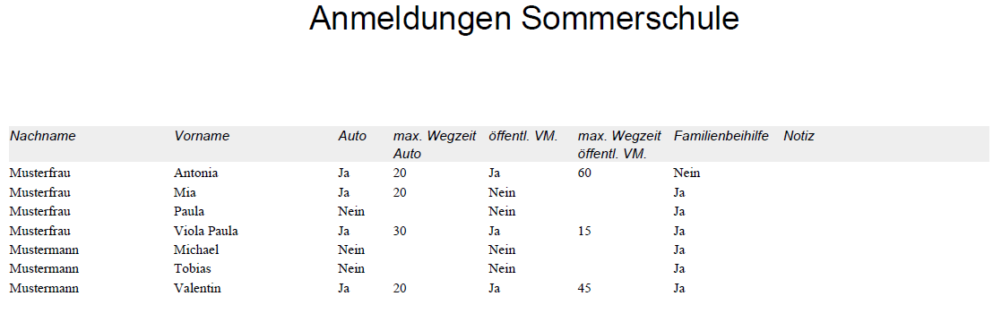 Die Schüler, die zu der Sommerschule angemeldet wurden, können mit diesem Report auf einer Liste erzeugt werden.