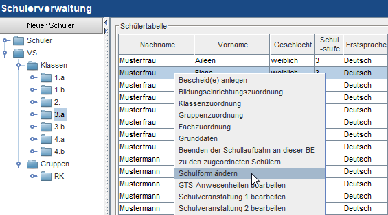 Die Schulform wird grundsätzlich in der Schulstruktur bei der Klasse vorgegeben.